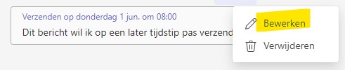 - Extra tip: Mocht je het geplande tijdstip toch nog willen wijzigen, dan kan dat door het bericht te bewerken. Klik hiervoor op de 3 puntjes achter het bericht en kies voor ‘Bewerken’.